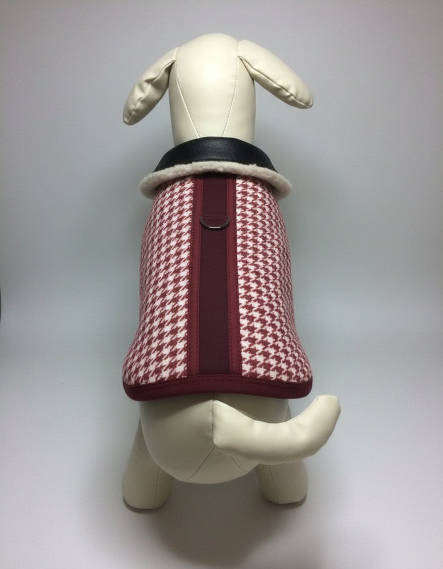 Autumn/winter coat in woven houndstooth wool/polyester, lined in faux sheepskin. This statement piece stands out for its meticulous details and sophisticated look.